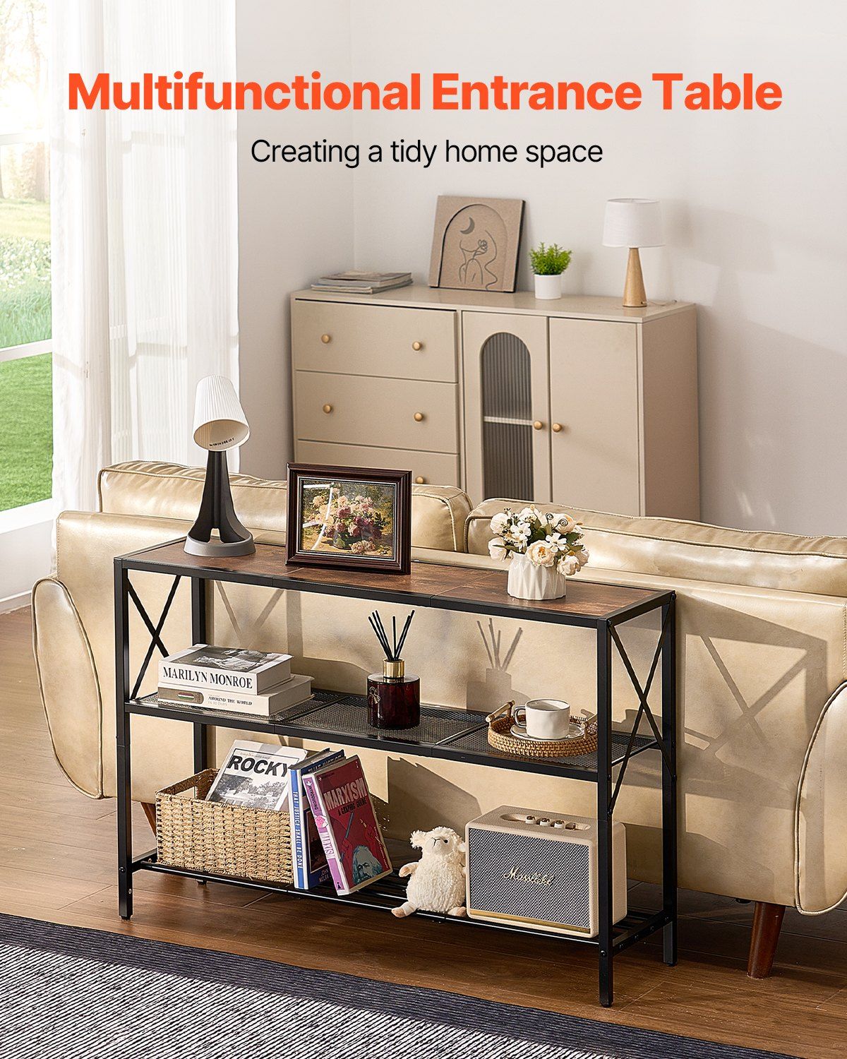 VEVOR Narrow Console Sofa Table, 41.7 inches Behind Couch Table, 3-Tier Long Entryway Table and Skinny Hallway Table, Narrow Sofa Table with Metal Frame, for Entryway, Hallway, Living Room & Bedroom